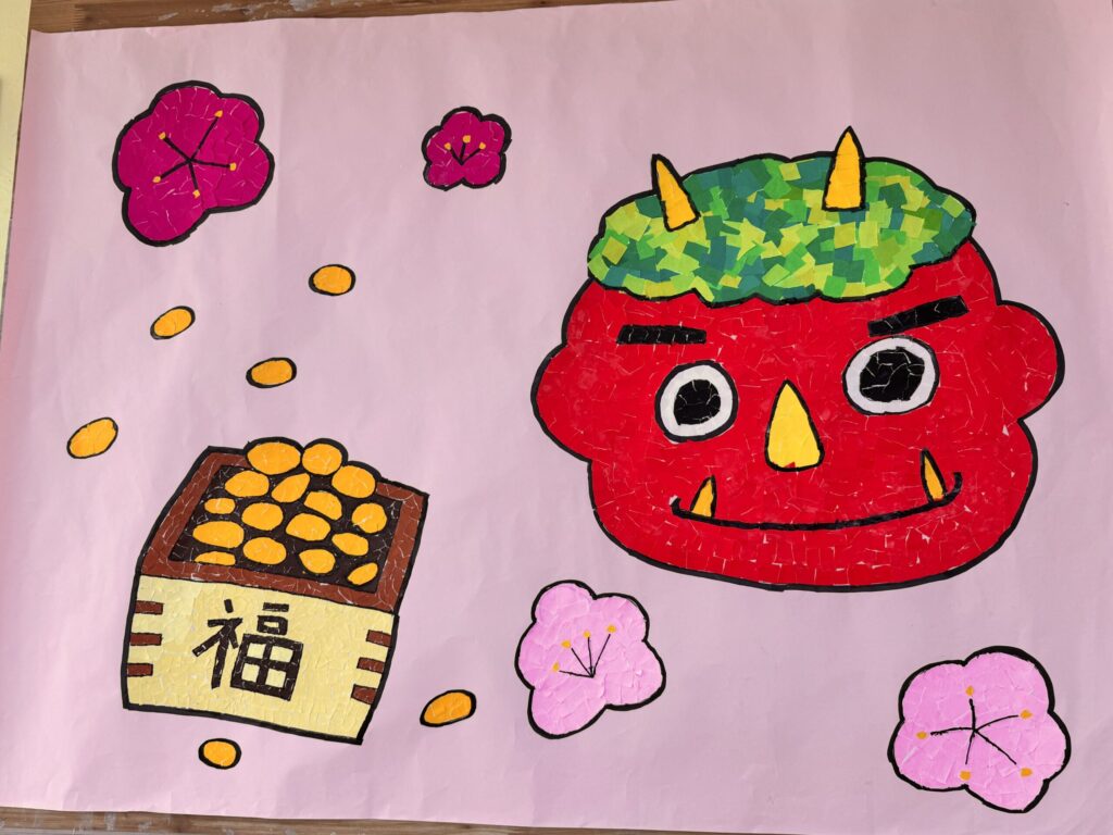 少し過ぎてしまいましたが、2月3日(火)が節分という事で入居者様と一緒に節分の貼り絵をしました☺️