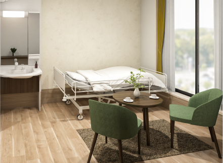 各居室では、快適な生活空間が確保されています。エアコン、照明器具、介護用電動ベッドなどが備え付けてあり、すぐに生活を始めることができます。また、住み慣れたご自宅の家具をお持ち込みいただくことも可能です。