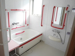 ■目立つように手摺りを赤にした浴室。