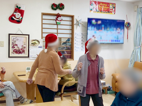 「あわてんぼうのサンタクロース」や「ジングルベル」などの定番クリスマスソングにのせて楽しく踊る方もいらっしゃり、それを見ていた他のご利用者様も合わせて手拍子👏🎶