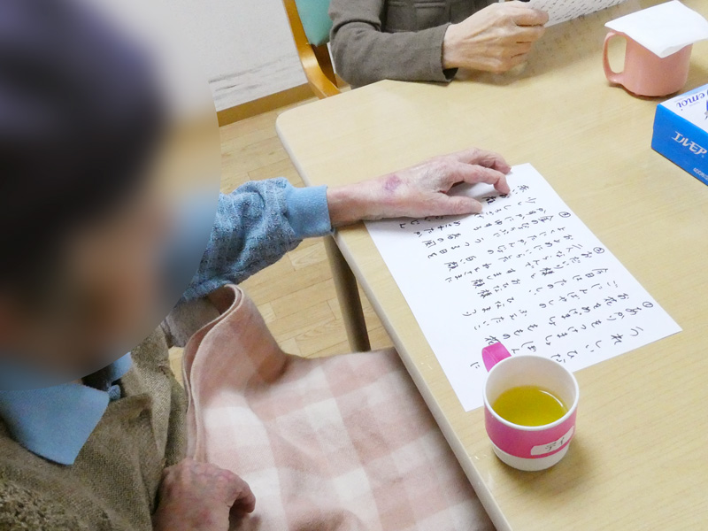 スタッフが手書きした歌詞の紙をお配りし、歌詞を見ながら音楽に合わせて歌っていただきました🎵