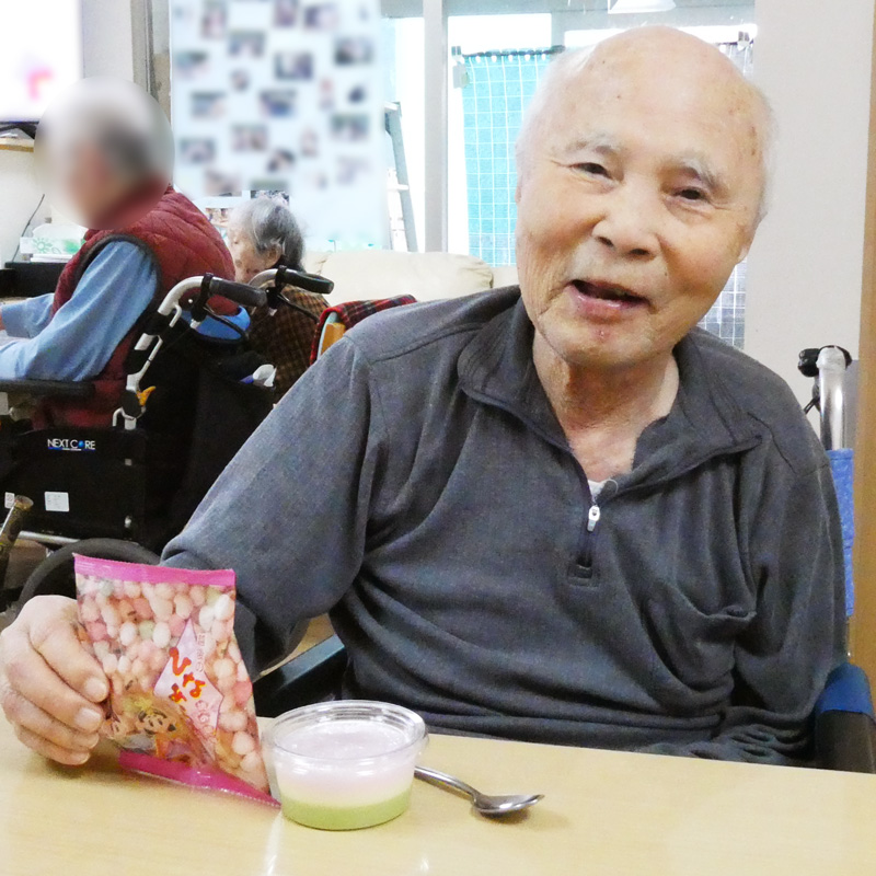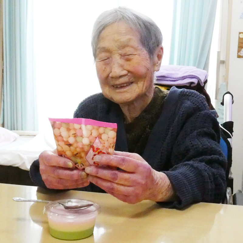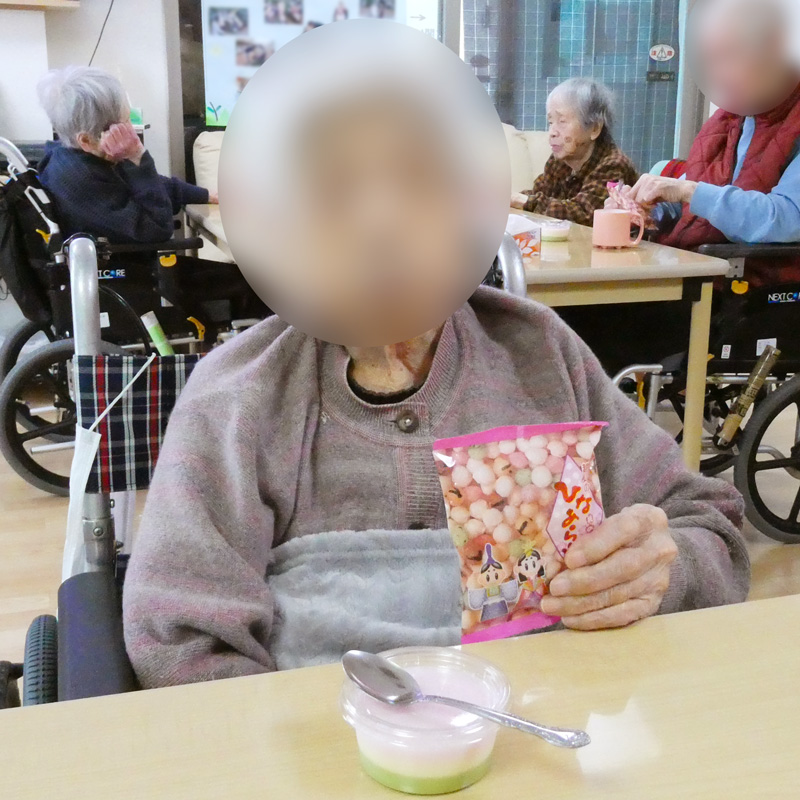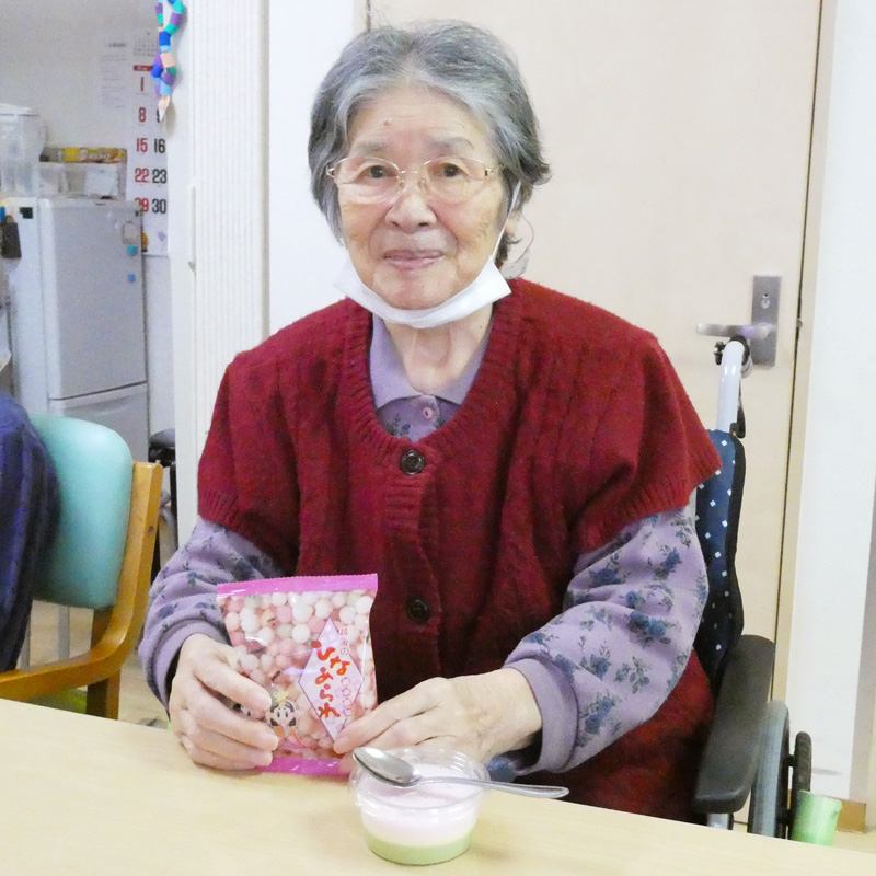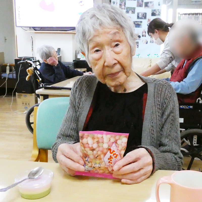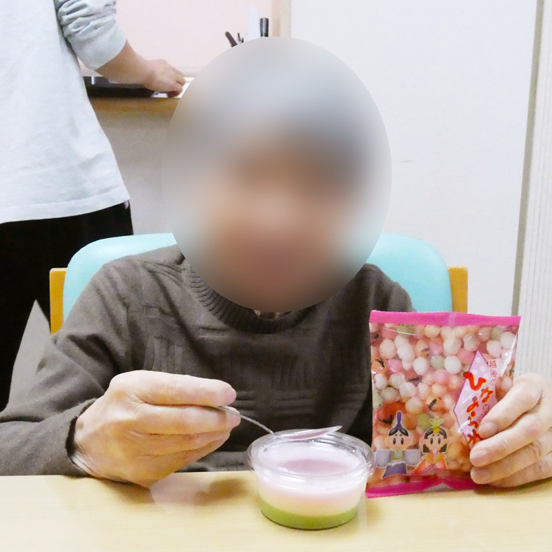 おやつには3色ムースとひなあられをご提供。