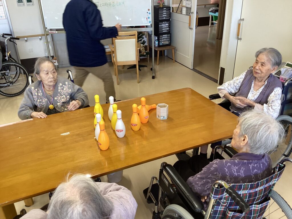本日のレクレーションは、ホールで過ごされていた方達と脳トレとボーリングを行いました!
