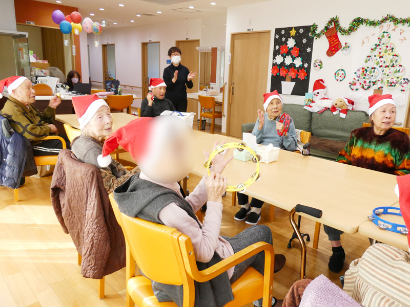 まずは全員でクリスマスソングを歌い、タンバリンや鈴でリズムに乗って楽しまれます🔔🎶