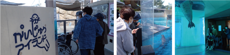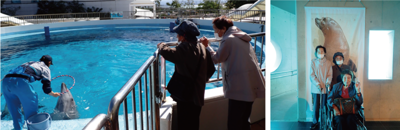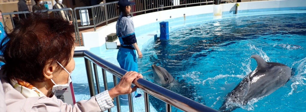 トレーニング中のイルカを間近で見学しながら、ご利用者様同士「おりこうさんねえ」「きらきらしてるよ」とおしゃべりされていました🐬